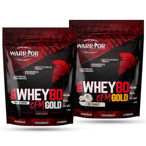 Srvátkový proteín Whey 80 WPC80 Gold je vysoko kvalitný srvátkový proteínový koncentrát so skvelou rozpustnosťou. Kvalitou sa vyrovná najznámejším americkým značkám proteínov a vďaka svojej cene je tou najlepšou voľbou pre náročných zákazníkov. Práve najvyššiu kvalitu a čistotu sme totiž pri dôkladnom výbere dodávateľa dali na prvé miesto.Proteín je vyrábaný metódou CFM (Cross Flow Microfiltration), ktorá je veľmi šetrná a najefektívnejšie zachováva všetky vitamíny a minerály obsiahnuté v proteíne. Pre náročnejších zákazníkov sme pripravili aj hotové ochutené verzie tohto proteínu. K dispozícii je aj široký výber príchutí či už v tabletách alebo v prášku.Vynikajúci aminokyselinový profil robí z Whey 80 CFM Gold špičkový produkt pre športovcov. Podiel aminokyselín BCAA je takmer 23%. Výhodou proteínu je jeho rýchla vstrebateľnosť, vďaka čomu je ideálnou voľbou po tréningu, ale aj pred ním. Je vhodnou voľbou pri rýchlejšom dosahovaní vašich športových či výživových cieľov.Whey 80 CFM Gold od Warrior je správnou voľbou pre každého, kto si potrpí na kvalitu a čistotu produktov.Proteín nie je geneticky modifikovaný (non GMO). Výroba prebiehala pri nízkych teplotách metódou CFM (Cross Flow Microfiltration), takže všetky výživné látky, minerály a vitamíny zostali v proteíne zachované.Len u nás dostanete špičkovú kvalitu za dlhodobo najlepšiu cenu. O tom, že vám ponúkame naozaj len to najlepšie, sa môžete presvedčiť sami - v prílohe vám predkladáme výsledok analýzy ako dôkaz toho, že kvalita je u nás vždy na prvom mieste. Obsah bielkovín v proteíne bol navyše potvrdený nezávislým testom v akreditovanom laboratóriu v Slovenskej republike. Náš TIP!V našej ponuke nájdete aj Whey 90 CFM Gold, či už v ochutenej alebo neochutenej verzii.U nás máte na výber z množstva lahodných ochutení:Natural – čistá verzia bez ochujúcich zložiek – aróm, farbív, sladidiel,…Chocolate – čokoládaVanilla – jemná vanilkaChocolate DeLuxe – lahodná čokoláda DeLuxeCoconut – exotický kokosButter Cookies – maslové sušienkyBanoffee – anglický karamelovo-banánový dezertBlueberry Vanilla – čučoriedky s vanilkouChocolate Mint – čokoláda v spojení s osviežujúcou mätouStrawberry Sweet - sladká jahodaZloženieNatural: srvátkový proteínový koncentrát WPC80 (mliečna bielkovina), slnečnicový lecitín.Banoffee: srvátkový proteínový koncentrát WPC80 (mliečna bielkovina), aróma, sladidlo: sukralóza, slnečnicový lecitín.Blueberry Vanilla: srvátkový proteínový koncentrát WPC80 (mliečna bielkovina), aróma, sladidlo: sukralóza; slnečnicový lecitín.Butter Cookies: srvátkový proteínový koncentrát WPC80 (mliečna bielkovina), aróma, sladidlo: sukralóza; slnečnicový lecitín.Chocolate: srvátkový proteínový koncentrát WPC80 (mliečna bielkovina), kakao, aróma, sladidlo: sukralóza; slnečnicový lecitín.Chocolate DeLuxe: srvátkový proteínový koncentrát WPC80 (mliečna bielkovina), glycín, aróma, kakao, soľ, sladidlo: sukralóza, slnečnicový lecitín.Chocolate Mint: srvátkový proteínový koncentrát WPC80 (mliečna bielkovina), kakao, aróma, sladidlo: sukralóza; slnečnicový lecitín.Vanilla: srvátkový proteínový koncentrát WPC80 (mliečna bielkovina), aróma, sladidlo: sukralóza; slnečnicový lecitín.Coconut: srvátkový proteínový koncentrát WPC80 (mliečna bielkovina), L-glycín, aróma, soľ, sladidlo: sukralóza, slnečnicový lecitín.Strawberry sweet: srvátkový proteínový koncentrát WPC80 (mliečna bielkovina), jahodový prášok (nosič: maltodextrín), aróma, regulátor kyslosti: kyselina citrónová; sladidlo: sukralóza; slnečnicový lecitín. Alergény: laktóza.Upozornenie: Prípravok nie je vhodný pre deti, osoby do 15 rokov, tehotné a dojčiace ženy. Výrobok sa nesmie používať ako náhrada rozmanitej stravy. Uchovávajte mimo dosahu malých detí. Ustanovená odporúčaná denná dávka sa nesmie prekročiť.Skladovanie: Skladujte v suchu, mimo priameho slnečného žiarenia pri teplotách 6-25°C. Nevystavujte mrazu a vlhkosti.Použitie a dávkovanie: Používa sa ako doplnkový zdroj bielkovín najmä pre športovcov a je ho najvhodnejšie konzumovať ihneď po tréningu. Bežná jednorazová dávka predstavuje 30g (pri Chocolate DeLuxe: 35g) Doporučenú dávku rozmiešajte v približne 300ml vody.Distribútor: Green Medical, s.r.o., Rybná 716/24, 110 00 Praha 1, Česká republikaVýživové údaje v 100gNaturalBanoffeeBlueberry VanillaButter CookiesChocolateChocolate DeLuxeChocolate MintVanillaCoconutStrawberry SweetEnergetická hodnota1705kJ/400kcal1683kJ/395kcal1693kJ/397kcal1682kJ/395kcal1668kJ/392kcal1643kJ/386kcal1675kJ/393kcal1691kJ/397kcal1683kJ/395kcal1674kJ/393kcalBielkoviny75g72g72g72g70g72g71g71g74g68gSacharidy6g8g9g9g9,6g7g9g10g8g12gz toho cukry6g6g6g6g5,6g5g6g6g5g10gTuky7g7g7g7g7g7g7g7g6g6gz toho nasýtené mastné kyseliny2,3g2g2g2g2,4g2g2g2g2g2gSoľ0,375g0,36g0,37g0,36g0,35g1,49g0,36g0,36g0,64g0,35g Aminokyselinový profil% obsah aminokyselín v 100g Alanín5.00Arginín2.10Asparágová kyselina11.00Cysteín2.20Glutámová kyselina18.10Glycín1.40Histidín1.70Izoleucín6.40Leucín10.60Lyzín9.60Metionín2.20Fenylalanín3.00Prolín5.50Serín4.60Treonín6.70Tryptofán1.40Tyrozín2.60Valín5.90 Typický profil minerálov v 100gSodík 0,2gDraslík 0,6gVápnik 0,5gFosfor 0,3gHorčík 0,1gChlór0,1g